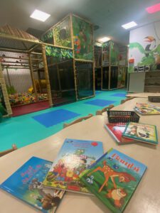 Die liebevoll gestalteten Wände mit Dschungelmotiven schaffen eine fantasievolle Umgebung, in der sich Kinder sofort wohlfühlen.