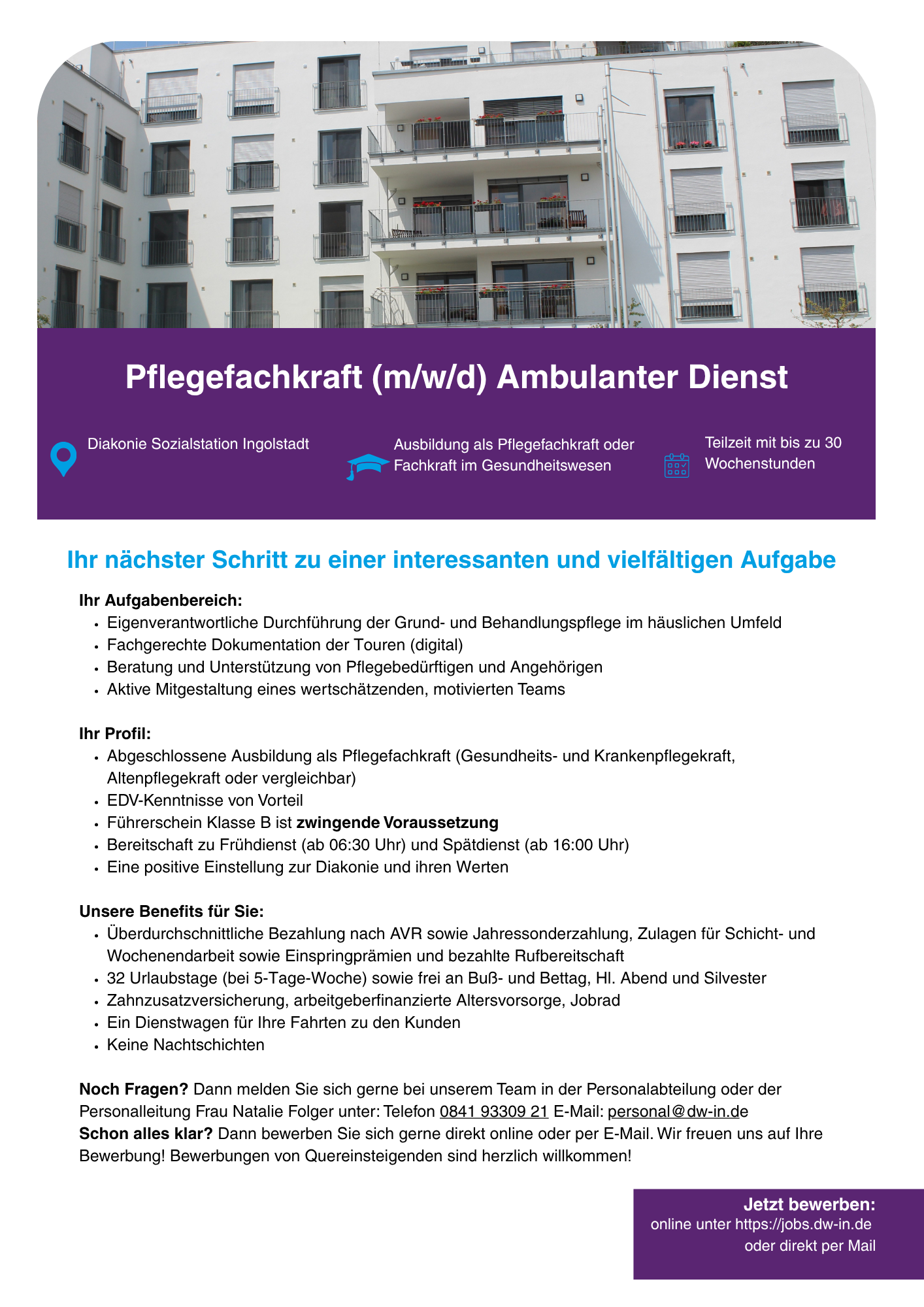 Noch Fragen? Dann melden Sie sich gerne bei unserem Team in der Personalabteilung oder der Personalleitung Frau Natalie Folger unter: Telefon 0841 93309 21 E-Mail: personal@dw-in.de